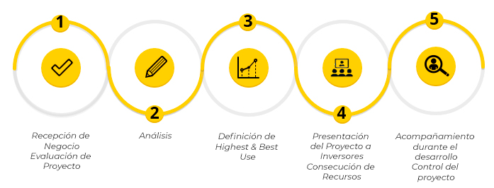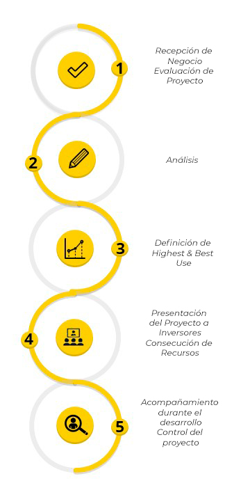 Análisis de varios escenarios en donde se determine el mejor uso del activo y la estructura óptima de capital. Utilizando nuestra experiencia en materia inmobiliaria, de mercadeo y sus relacionales con entidades bancarias y no bancarias para explorar alternativas de creación de valor a través de una estructuración financiera.